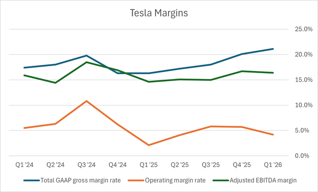 本季度现金流意外转正。2026年前三个月,特斯拉资本支出不足25亿美元,大约只有实现全年支出目标所需每季度平均支出的一半。这使特斯拉当季实现了14亿美元的正向自由现金流,远好于分析师预期的约19亿美元资金净消耗。
