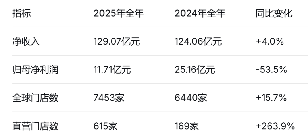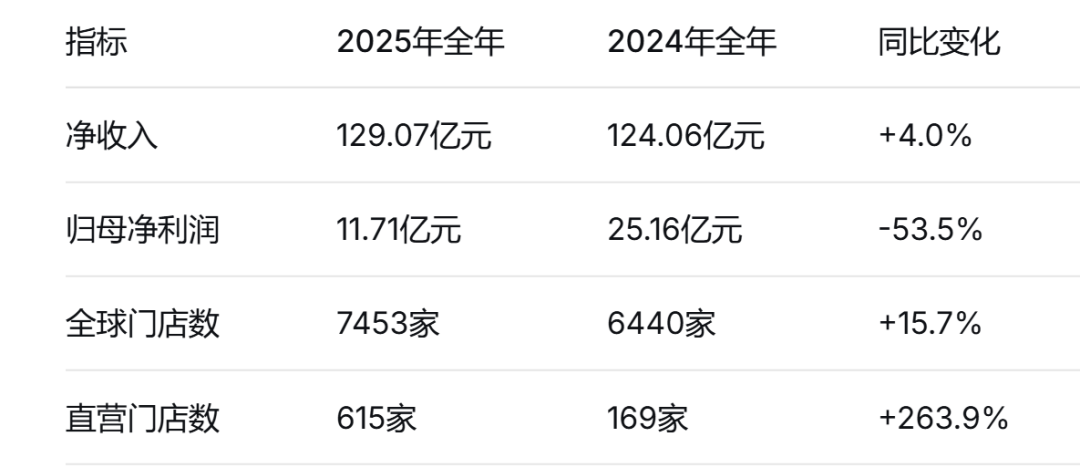 2025年全年,霸王茶姬净收入129.07亿元,同比增速放缓至4%。而2023年和2024年的营收增速分别为843%和167%。归母净利润从2024年的25.16亿元下降至11.71亿元,同比减少53.5%。