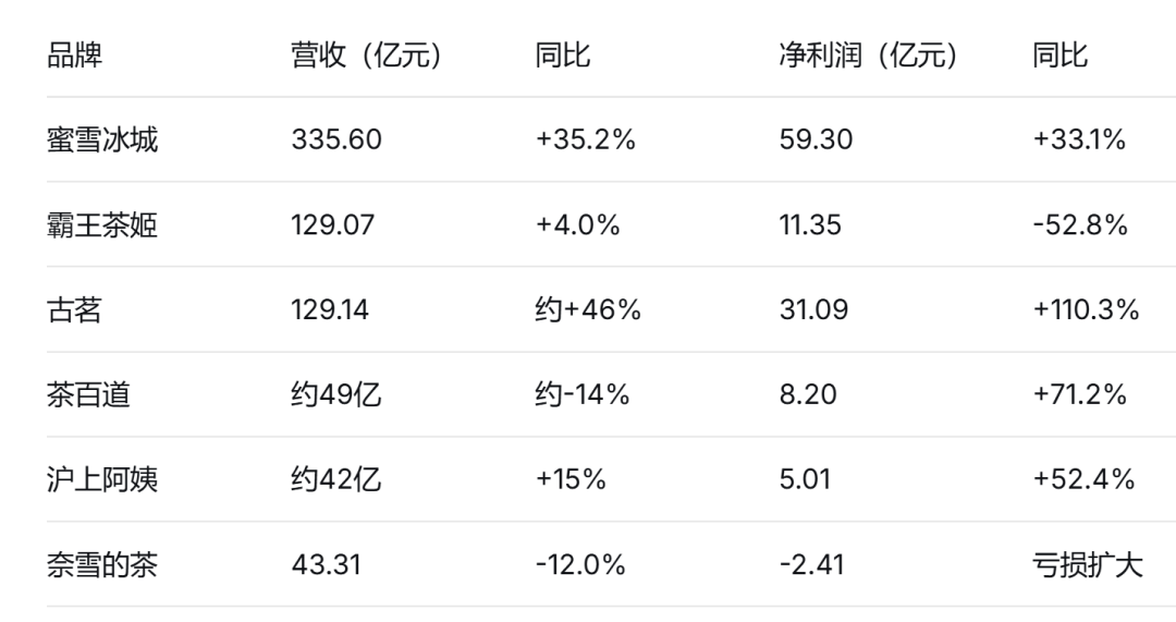 主要新茶饮企业2025年业绩对比: