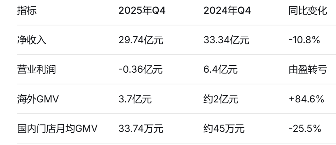 这一转变对加盟商的盈利能力提出了更高要求。大中华区单店月均GMV从2023年第四季度的57.4万元,连续8个季度下滑至2025年第四季度的33.74万元,缩水超过四成。部分加盟商的经营压力明显增大。