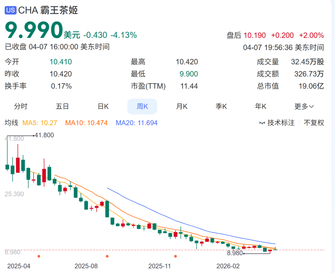 上市初期,霸王茶姬以28美元发行,市值一度达到76亿美元。财报发布后,股价调整至9.99美元,总市值约19亿美元,较前期高点蒸发约400亿。
