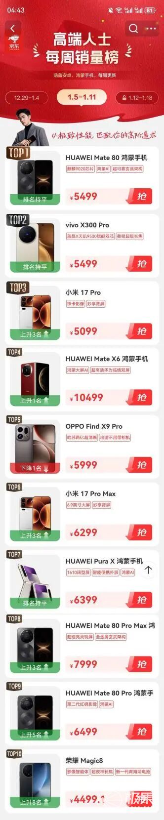 京东高端商务人群手机销量榜单(1.5-1.11)