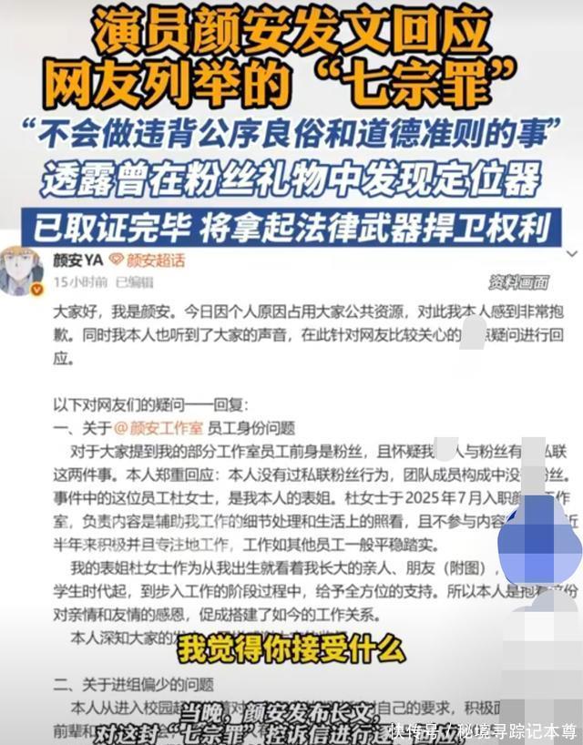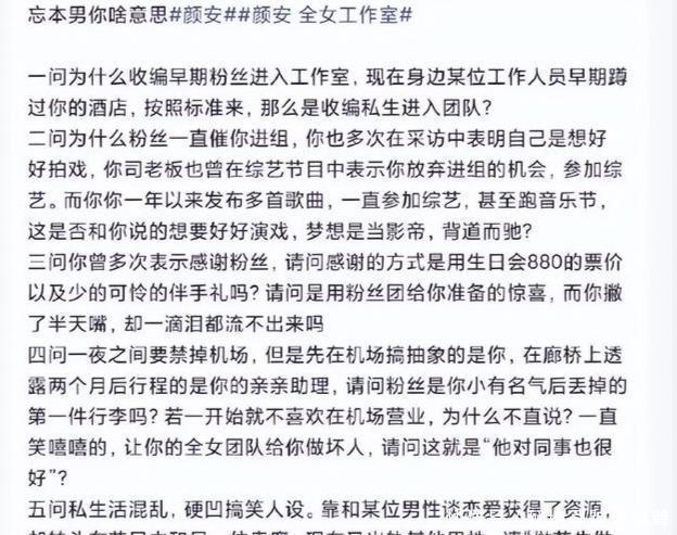 可谁曾想,粉丝一篇“七连问”直接给这爽文泼了盆冰水,还是加了冰碴子的那种。 爆料者自称多年老粉,字里行间满是“爱之深责之切”的怒火,开篇就给颜安扣上“忘本男”的帽子。 后续罪状更是条条劲爆到让人下巴掉,创办工作室居然收编私生饭当员工,私联粉丝没边界。